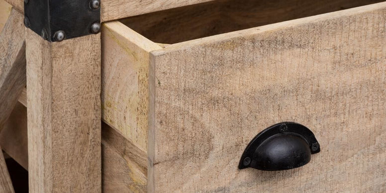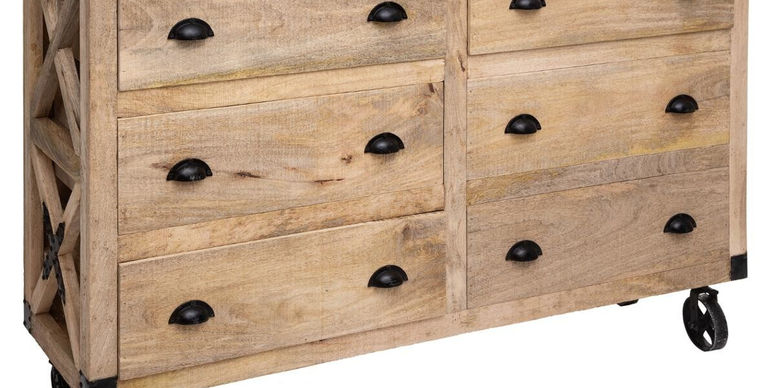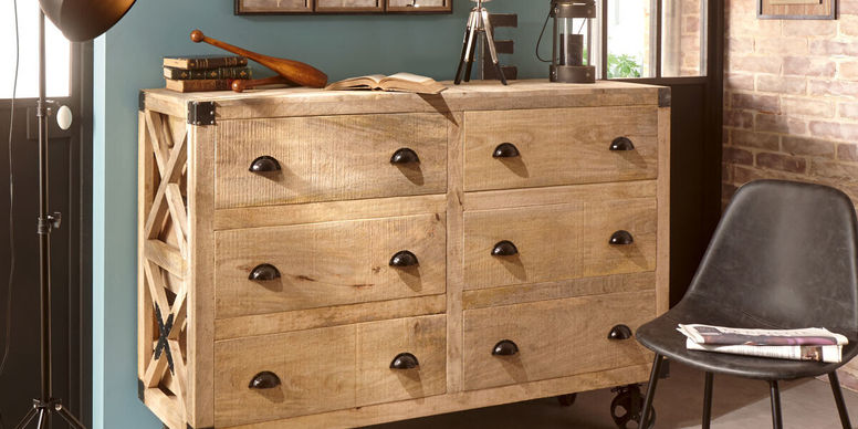On apprécie le design épuré du buffet "Silas" ainsi que sa praticité. Réalisé en bois de manguier, il est résistant, mais aussi fonctionnel : il est composé de six tiroirs disposés sur des roues en métal.