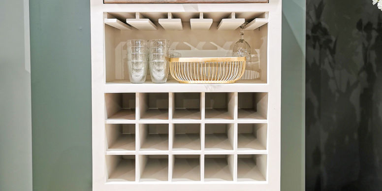 Ce meuble bar "Aleria" a été pensé pour accueillir tous les éléments essentiels à l'apéritif. Il dispose d'emplacements pour suspendre les verres à pied, de casiers pour quinze bouteilles, d'un tiroir pour vos accessoires, d'une niche de rangement et d'un plateau pour poser ce dont vous aurez besoin en fonction du nombre d'invités.