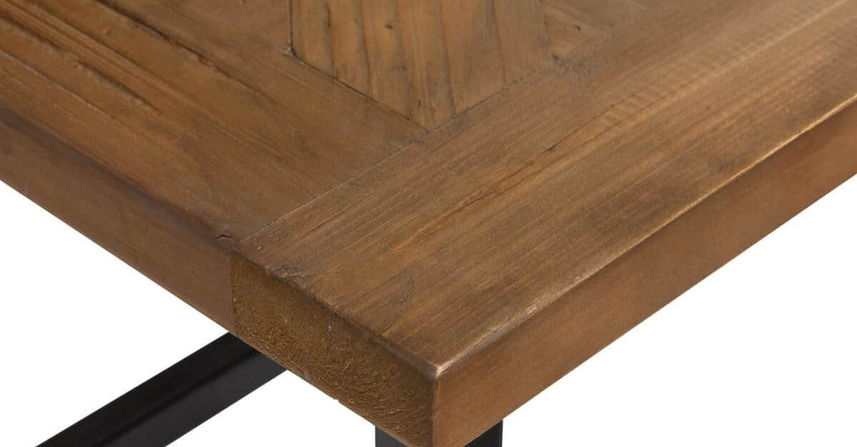 Esthétique, mais également éthique, le plateau de la console en marqueterie "Corte" à été fabriqué à partir de pin recyclé lui apportant à la fois de la résistance et de la légèreté. On aime les lignes graphiques de la structure en acier qui lui confèrent un charme industriel.