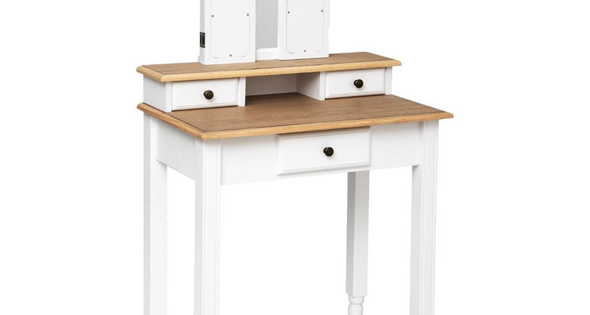 La coiffeuse "Solen" multiplie les atouts. Ses trois tiroirs vous permettent de conserver tous vos essentiels de beauté à portée de main. Son plateau à deux étages est idéal pour organiser les produits en fonction de leur usage ou de leur fréquence d'utilisation.
