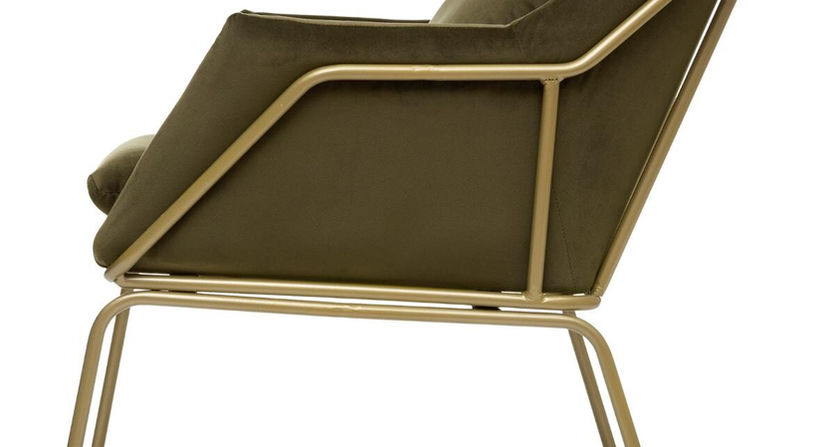 Le siège repose sur un piètement luge en métal tubulaire rendu actuel par une finition métallisée dorée qui contraste avec le tissu sombre velouté. Cet élégant fauteuil s'intègrera facilement dans un salon contemporain.